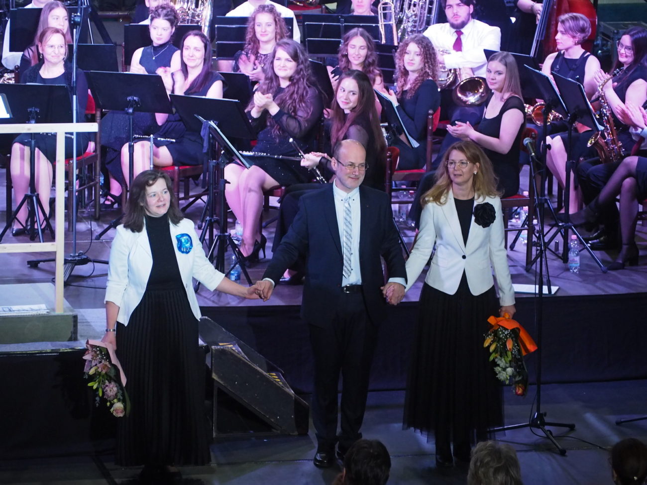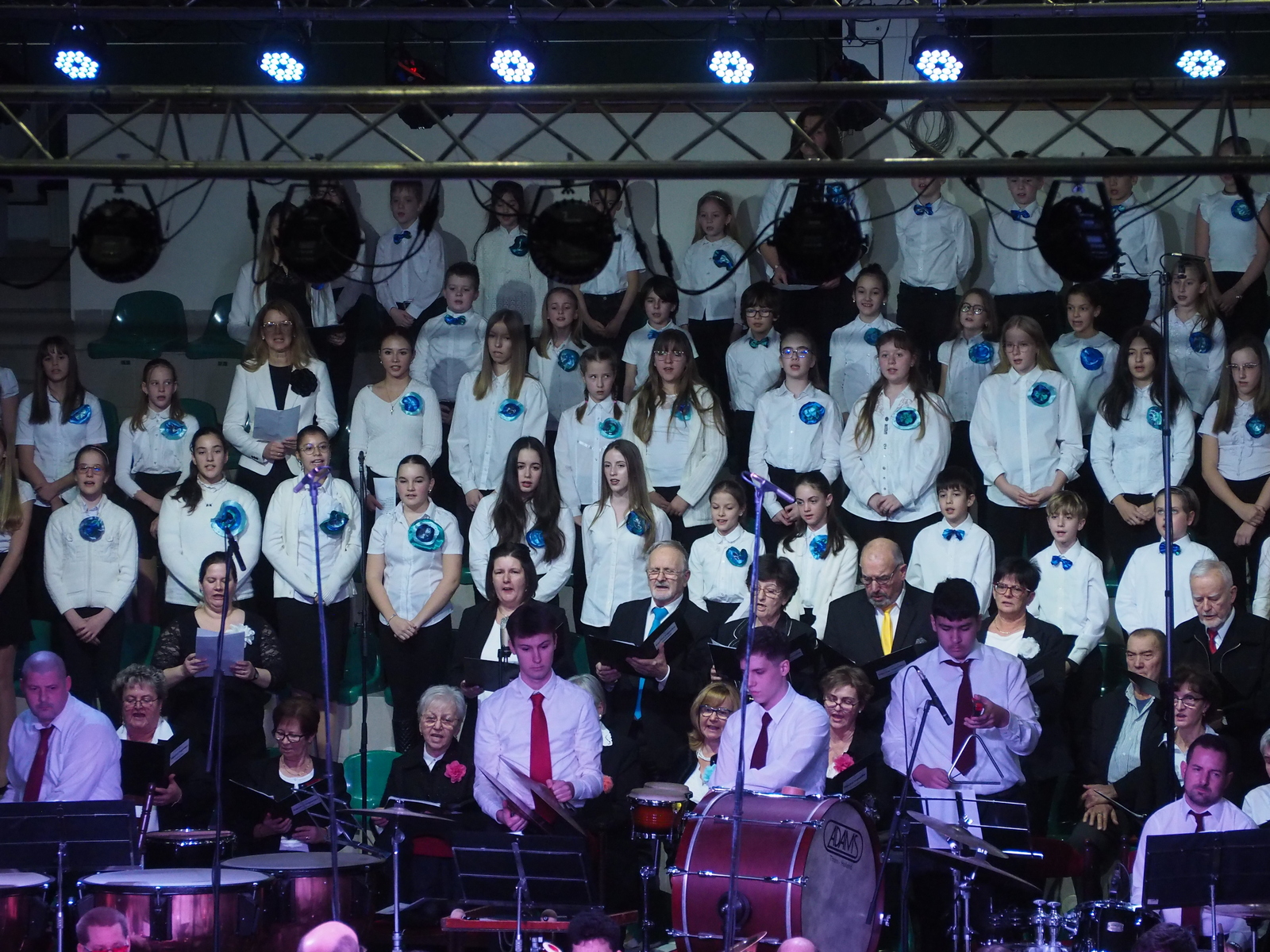 A szünetet követően pedig igazi meglepetésként a zenekar újévi produkciójához első ízben énekhang is társult, több kórussal együtt zenéltek a fúvósok. A zenekar háta mögött a Tapolcai Vegyeskar, valamint a Bárdos Lajos Általános Iskola Kicsinyek Kórusa és a Bárdos Lajos Gyermekkar énekelt. Elsőként Liszt Ferenc: Magyar ünnepi dalát adták elő, amely eredetileg kórusmű. Akapella, vagy zongorakísérettel szoktak előadni, fúvózenekarral történő előadása igen rendhagyó és különleges, páratlan élményt nyújtott a közönségnek a nem mindennapi összeállítás.